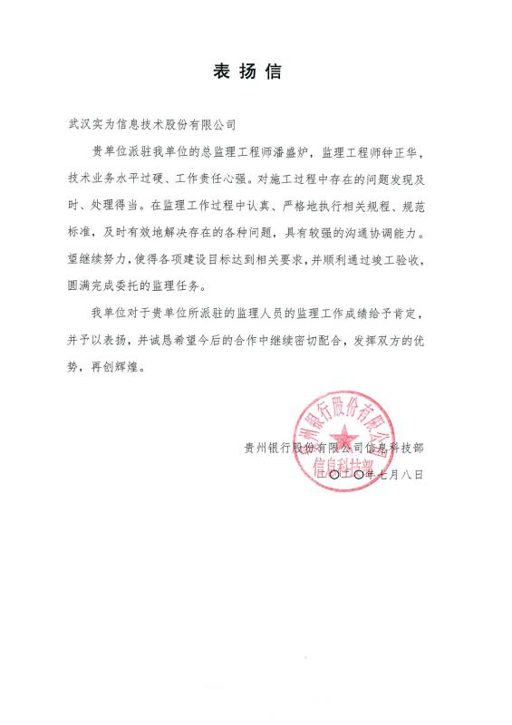 實為公司承擔(dān)貴州銀行股份有限公司總行辦公大樓安防及智能化設(shè)計建設(shè)項目監(jiān)理服務(wù)過程中,嚴格執(zhí)行相關(guān)規(guī)范標準,及時有效解決項目存在的各種問題,獲得業(yè)主單位的充分肯定。
